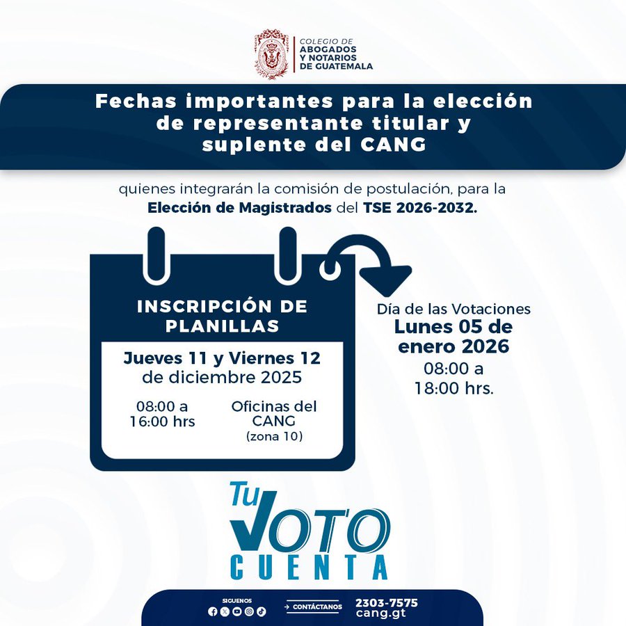 El Colegio de Abogados y Notarios de Guatemala (CANG) elige a su magistrado titular y magistrado suplente para la Corte de Constitucionalidad (CC) a través de un proceso de votación en la Asamblea General de Colegiados Activos.
