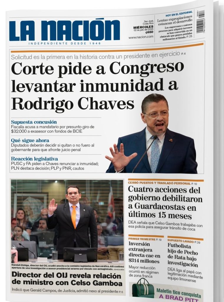 El pasado 1 de julio de 2025, la Corte Suprema votó 15–7 a favor de solicitar a la Asamblea Legislativa el retiro del fuero presidencial de Rodrigo Chaves, lo que permitiría iniciar un proceso penal por el presunto delito de concusión (abuso de poder) en el uso de fondos del BCIE. La Corte también incluyó al ministro de Cultura, Jorge Rodríguez, por los mismos casos .