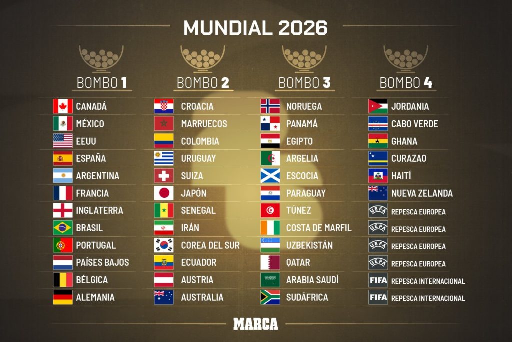 12 Cabezas de Serie: El Bombo 1 tendrá 12 equipos. Además de los tres anfitriones, los nueve equipos mejor clasificados en el Ranking FIFA (como Argentina, Francia, España y Brasil) serán los restantes cabezas de serie.