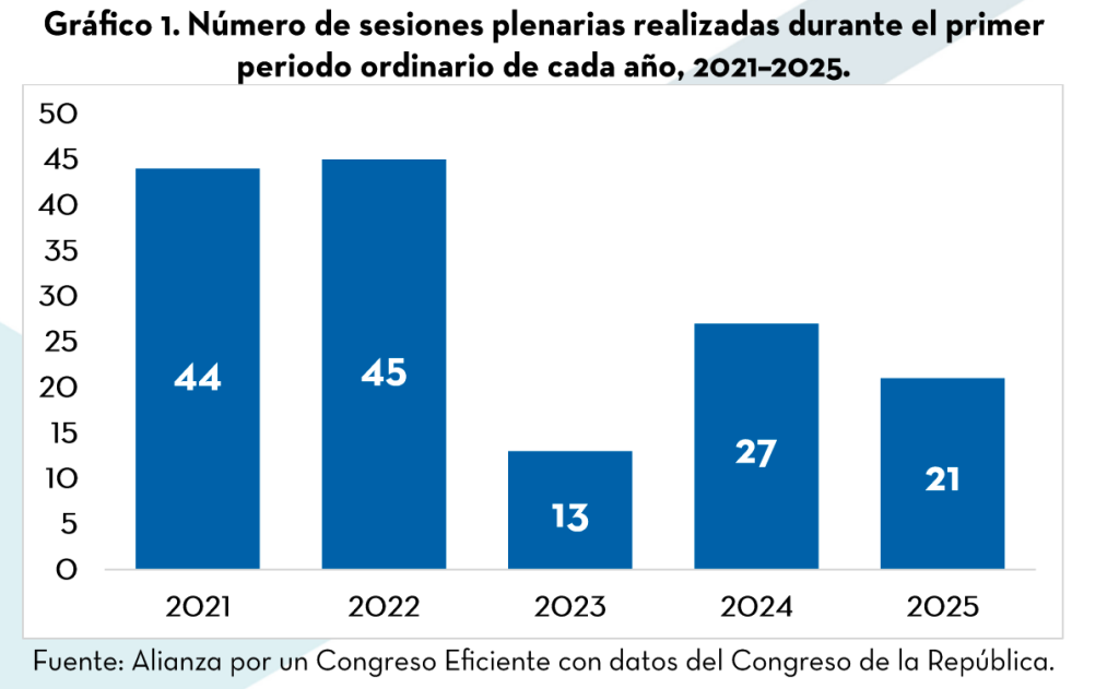 Según el informe oficial, durante el primer período ordinario del año 2025, el Congreso tenía programadas 52 sesiones plenarias, pero solo se realizaron 24 sesiones efectivas. Esto significa que más de la mitad fueron suspendidas, muchas de ellas por falta de quórum, un fenómeno recurrente que demuestra la falta de compromiso de muchos legisladores con su rol constitucional.