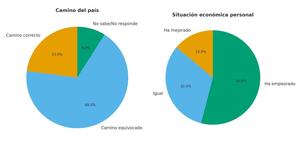 El estudio revela que 79 % de los guatemaltecos considera que el país va por el camino equivocado, frente a un 66 % registrado en 2024. El costo de la vida es la principal preocupación: 44 % de los encuestados asegura que aumentó mucho en los últimos cuatro meses, y la misma proporción afirma que su situación económica familiar ha empeorado en el último año.
