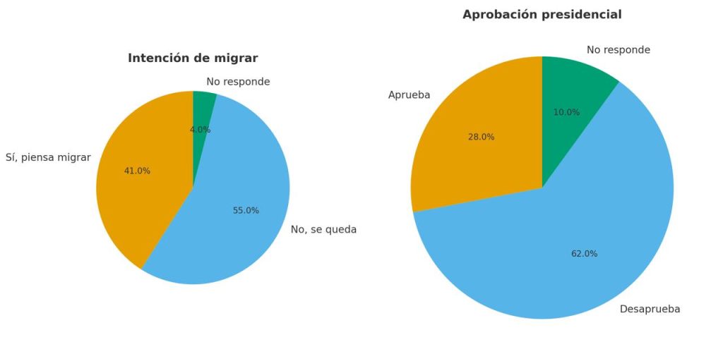 La encuesta revela también que 24 % de los guatemaltecos migraría si tuviera los recursos para hacerlo. Entre los jóvenes y las personas con educación superior, esa intención es todavía más alta. En paralelo, 21 % de los hogares conoce a alguien deportado desde Estados Unidos en los últimos seis meses, lo que muestra la vigencia del fenómeno migratorio.