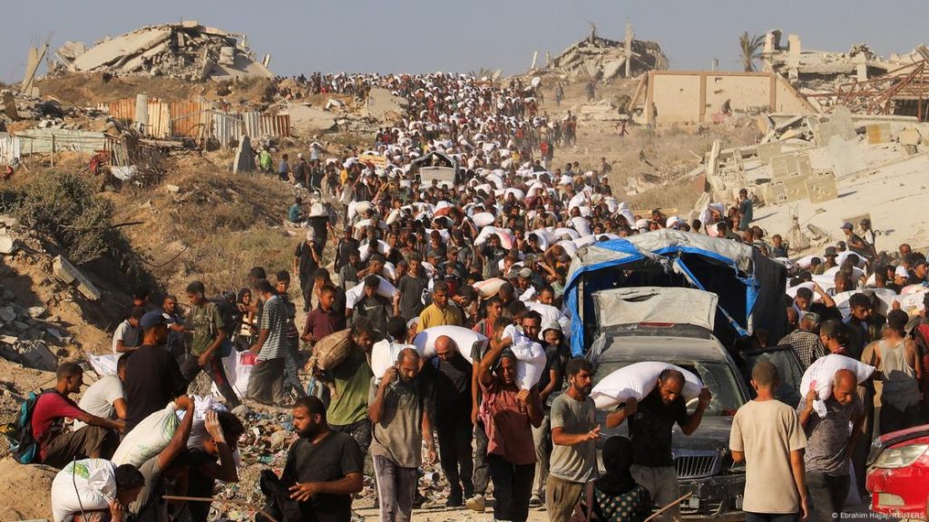Una multitud de palestinos cargan a pie con alimentos y otros bienes de ayuda humanitaria en Beit Lahia, en el norte de la Franja de Gaza.