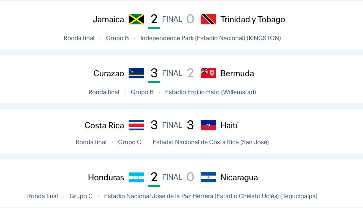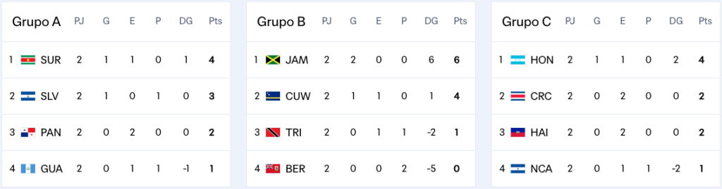 Suriman en el grupo A, Jamaica en el B y Honduras en el C son líderes y llegarán a la siguiente jornada que se disputará en octubre con las mejores posibilidades de seguir sumando. Los dos mejores segundos lugares son El Salvador y Curazao.