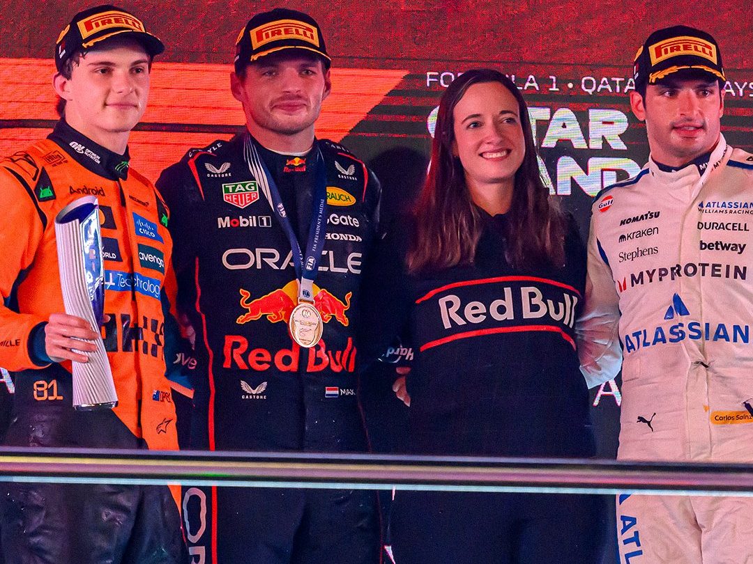 En el podio de Qatar junto a Piastri, Verstappen y Sainz. Una mujer triunfa en un mundo que era reservado en su mayoría para hombres.