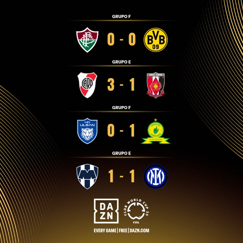 La fase de grupos de este nuevo formato del Mundial de Clubes ha dado algunos resultados que pueden parecer sorpresivos: el Borussia Dortmund tuvo suerte de salir con un 0‑0 ante Fluminense y el Inter fue sorprendido 1‑1 por Monterrey.