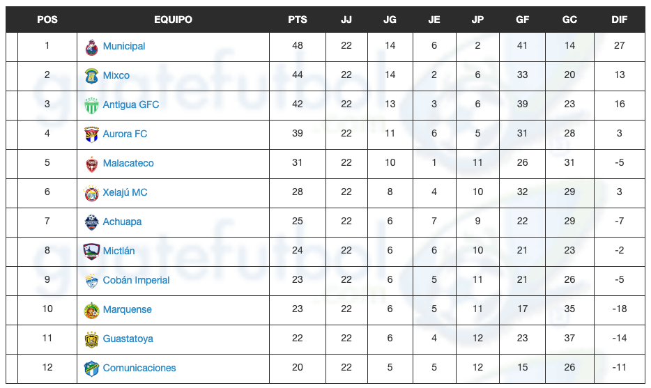 Los ocho equipos clasificados para disputar los cuartos de final son: Municipal, Mixco, Antigua GFC, Aurora, Mictlán, Achuapa, Xelajú MC y Malacateco que disputarán sus respectivas series luego de la programación que la Liga Nacional publicará después de su reunión del próximo martes.