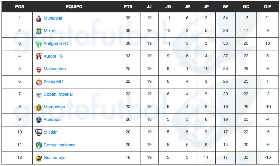 • A pesar de caer en el estadio Santo Domingo de Guzmán contra Deportivo Mixco por 1-0, el cuadro rojo mantiene el liderato de la tabla de posiciones pero el equipo chicharronero se puso a un punto y Antigua a 3 luego de vencer 3-0 a Guastatoya en el cierre de la jornada.