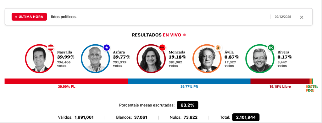 El candidato Salvador Nasralla ha pasado al primer lugar, con una diferencia mínima sobre Nasry Asfura, candidato apoyado por Donald Trump. La diferencia es de 4,427 votos, cuando van escrutados 63% de las urnas a las 15:00 horas de este martes (tiempo de Gutemala). En la fotografía, los resultados reportados «en vivo» por el diario La Prensa.