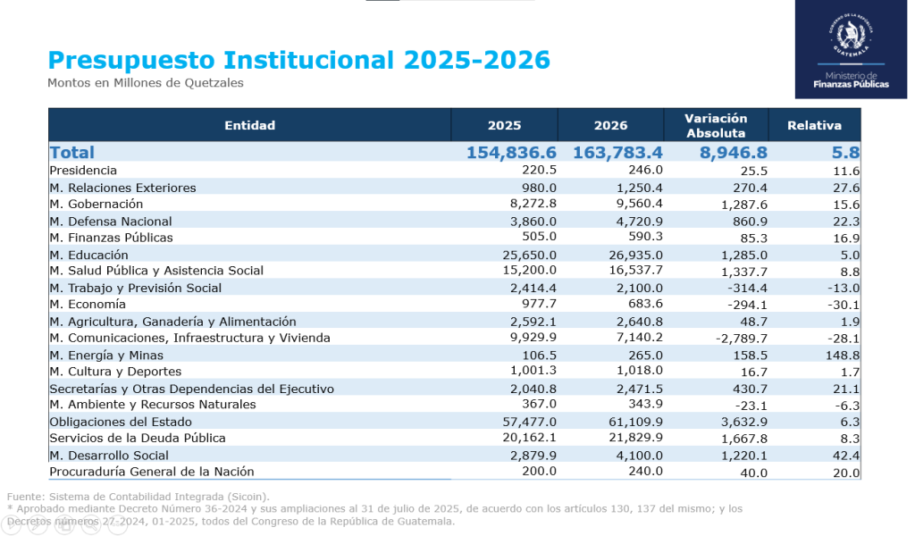 El presupuesto 2026 asciende a 163 mil 783.4 millones de quetzales y se encuentra ya en el Congreso para ser debatido y aprobado a más tardar en noviembre.