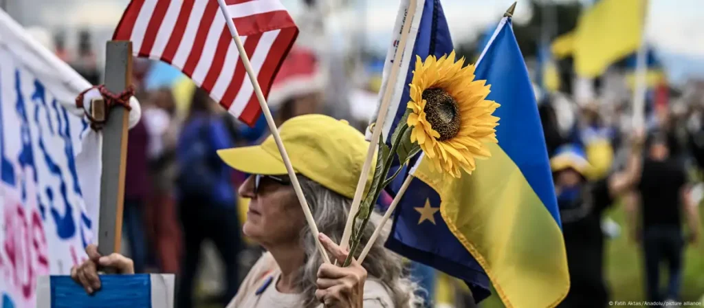 - Los manifestantes ondearon banderas ucranianas y pancartas con los colores azul y amarillo del país, exigiendo que Trump no haga concesiones a Putin a cambio de que el Kremlin ponga fin a la guerra en Ucrania.