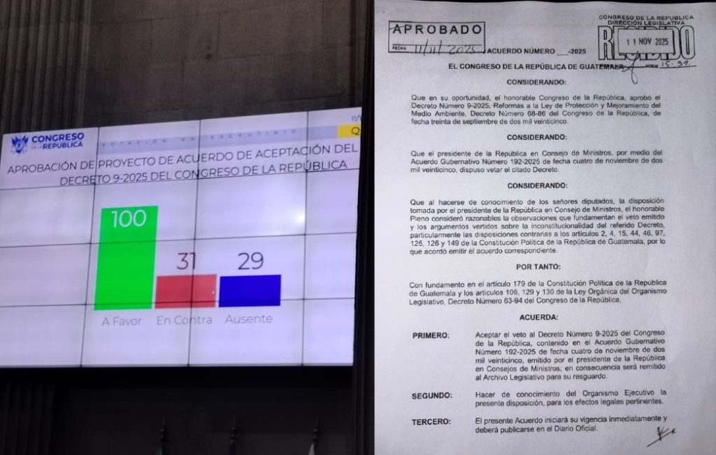 En paralelo, el Ejecutivo remitió el Acuerdo Gubernativo 192-2025 que formaliza el veto del presidente a las reformas aprobadas por el Congreso mediante el Decreto 9‑2025 —las cuales reformaban la Ley de Protección y Mejoramiento del Medio Ambiente (Decreto 68‑86)— al considerar que el nuevo texto “contraviene la Constitución” y debilita los estándares de protección ambiental.